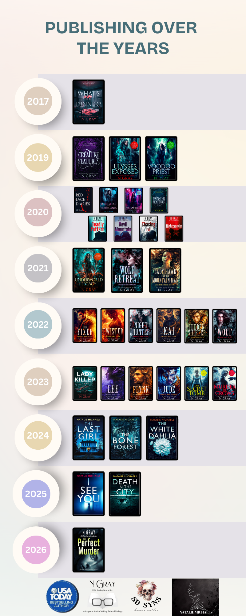 N Gray began her author career in 2017, and here we can see how many books she wrote each year and under the various pen names.